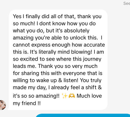 A direct edit of your subconscious operating system. We go into your belief layer — the core programs you’re running (like “I don’t deserve love” or “I always mess things up”) — and begin rewriting them with upgraded frequencies.What you’ll feel: